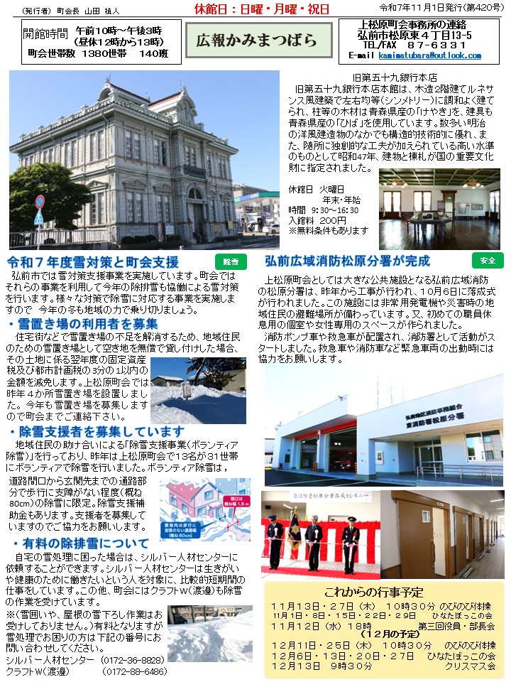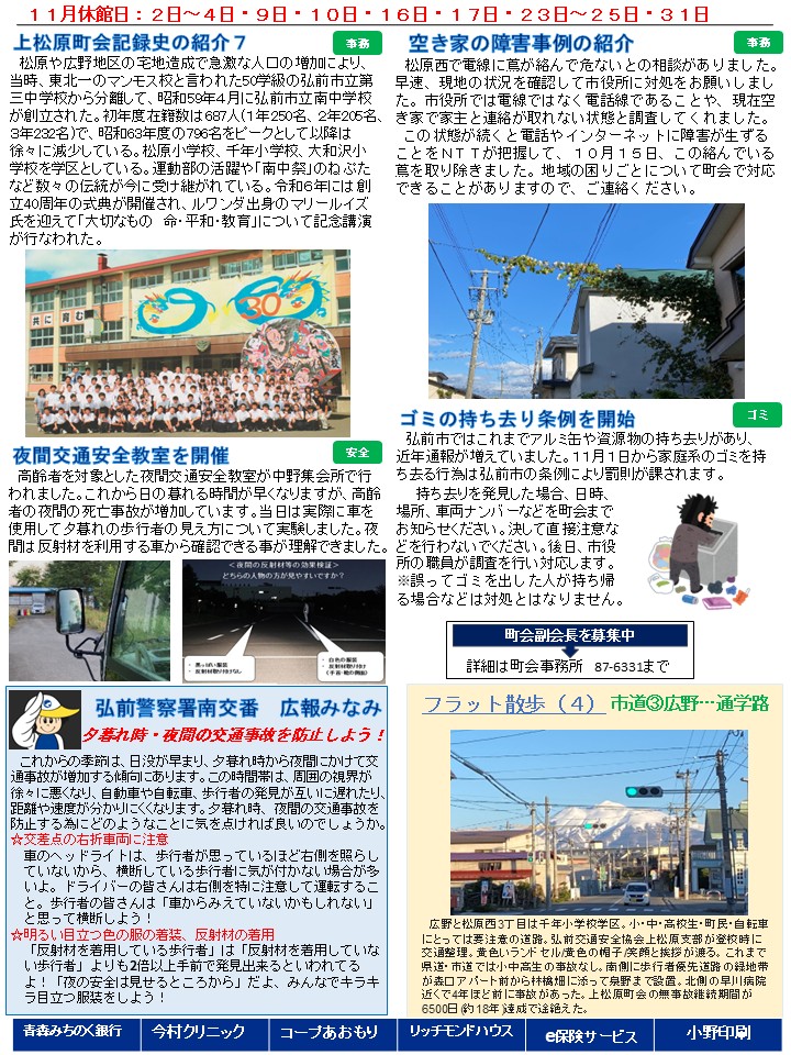 今月は今年の雪対策について紹介をしています。この他10月からスタートした弘前広域消防松原分署を掲載しています