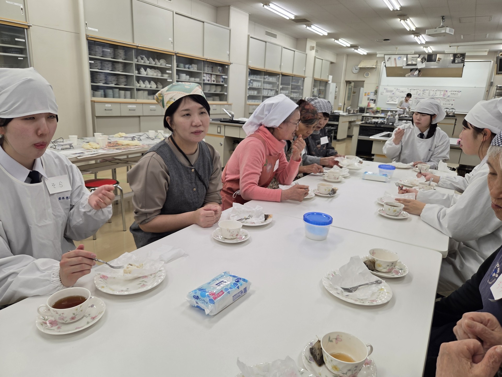 高齢者と高校生のふれあい交流会が11月18日弘前実業高校で行われました。当日は玄関で家庭科学科の生徒が参加者を出迎え調理室で、お菓子作りやミニ工作を行いました。米粉を使った蒸しパンを作って参加者が試食をしました。蒸しパンができる間ペットボトルのキャップを利用してキーホルダーを作りました、