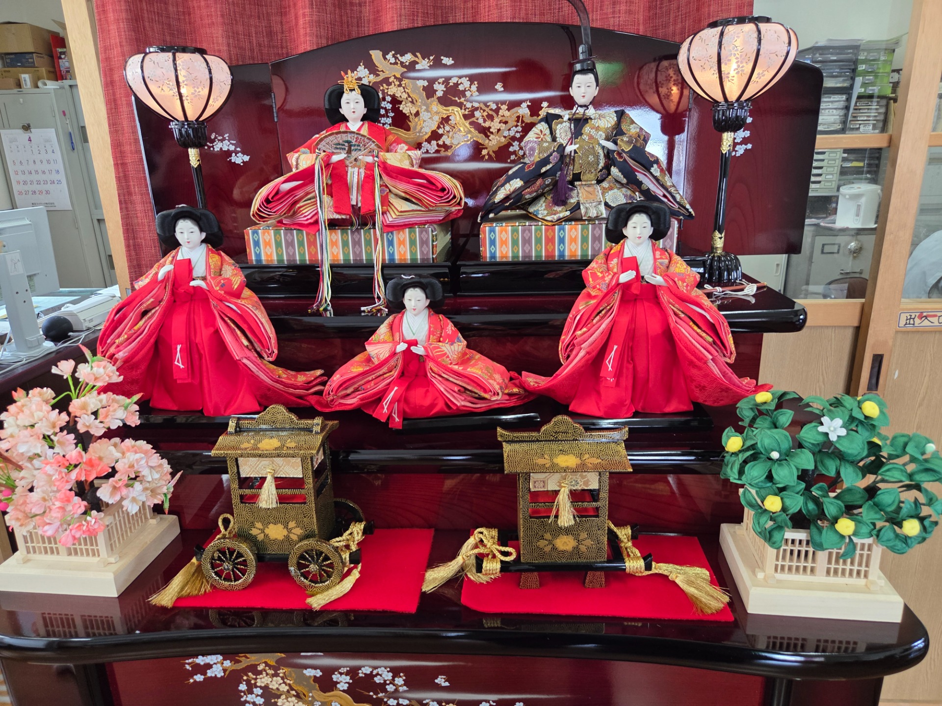 今年は記録的な大雪で大変な状況が続いていますが、上松原中央集会所にひな人形が飾られました。このひな人形は寄贈されたお雛様ですがこの他に玄関や1階の会議室には着物地のタペストリーが飾られ、少し早い春を醸し出しています。